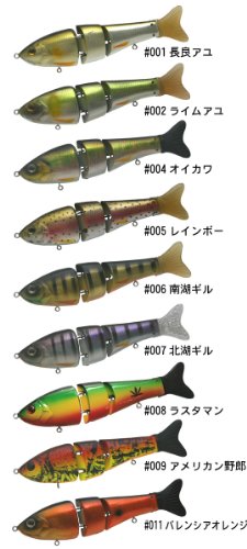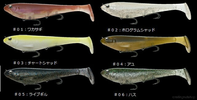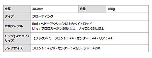 スペック 【全 長 】 195㎜ 【ウェイト】 57g 【タイプ 】 フローティング 【定 価 】 5300円 特 徴 ①ハイピッチ ナチュラルアクション ②ミノー系ビッグルアー 一 言 テールのソフト部分が、別売りで 手に入るのが、とてもうれしい! また、リップ部分も、問い合わせ すると、最寄りの釣具店で購入 可能! オリジナルより少し安いが、 中古の価格もあまり落ちない。 なので、手に入りにくい。 しかし、動きがとてもよく 評価は★×4.5という高評価!