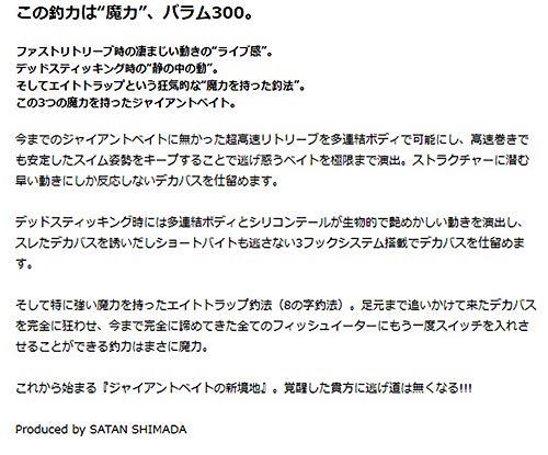 スペック 【全 長 】 300mm 【ウェイト】 168g 【タイプ 】 ? 【価 格 】 12420円 特 徴 ①超でかい!! ②作りがきれい! ③超高速リトリーブが可能 一 言 こちらも超でかく、価格が高い ビッグベイトです。 その分の価値がありそうな繊細な 作りです。 高速巻きでもきれいに泳ぐので 超おすすめ!