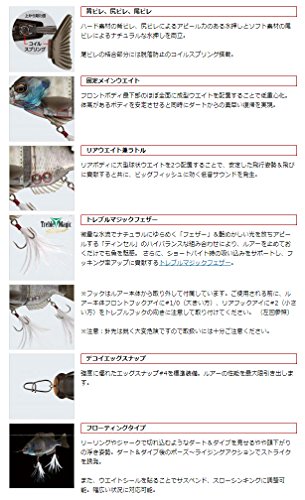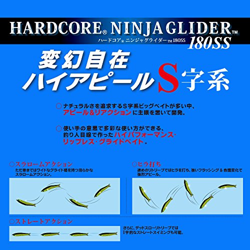 スペック 【全 長 】 175mm 【ウェイト】 60g & 65g 【タイプ 】 フローティング &サスペンド 【価 格 】 9180円 特 徴 ①胸鰭にシンカーがあり安定する ②高速アクションが可能 ③ジャークの動きがキレッキレ ④硬質ウレタン樹脂で頑丈 ⑤色が綺麗 一 言 こちらは、高速ジャークが可能な 高性能ビッグベイトです。 色もきれいで、カラーの バリュエーションも豊富です。 キレキレのジャークと スローリトリーブ時のゆらゆらの 両方で魚を誘います。 シンキングタイプもあるので、 海でのシーバスやそのほか ソルトウォーター全般で使えそう