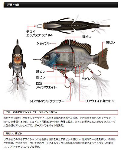 スペック 【全 長 】 200㎜ 【ウェイト】 5.4oz(153g) 【タイプ 】 フローティング 【定 価 】 4980円 特 徴 ①最大級のギル型ビッグベイト ②ギル型ビッグベイトだが、 滑らかなS字系アクション ③テール先端アイ付き 一 言 とても大きいです。 その分アピール力は抜群!! そのため使うポイントを 選ばないといけないのか レビュー評価は★×3.5