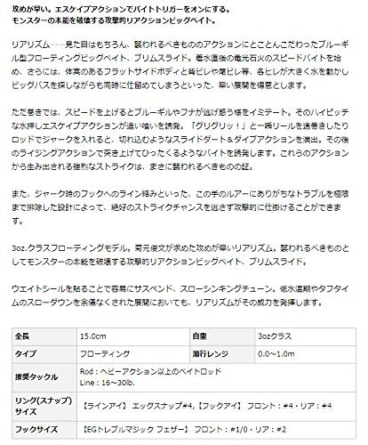 スペック 【全 長 】 160㎜ 【ウェイト】 70g 【タイプ 】 フローティング 【定 価 】 4010円 特 徴 ①ギル型ビッグベイト ②緩いストリーブ ③ストップした時の惰性時間が ヒットチャンス 一 言 180°ターンをすると、 ブラックバスも逃げちゃうくらい アピール力が強いが 釣り人の満足度も高く、 レビューでは★×5!!