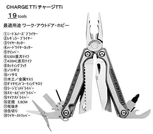 【製品概要】軽く強靭なチタンでプロテクトした「チャージ ティー・ティー・アイ」はレザーマンがフラッグシップモデルに位置する秀逸なモデルです。ナイフはS30Vのステンレスで作られており、柔軟性、高度のバランスが最高です。ハサミ、ドライバー、ノコギリ、栓抜きなどもバランスよく装備されていて、軽量でハンドルの強度と握り心地の良い、実用性の高い人気のモデルです。 【製品規格】「サイズ全長:10㎝(収納時)」「ナイフ刃渡り:7.37㎝」「重量:252g」「製品機能数:19」「価格:19,200円」※価格は平成30年1月12日現在、上記amazon URL記載のもの