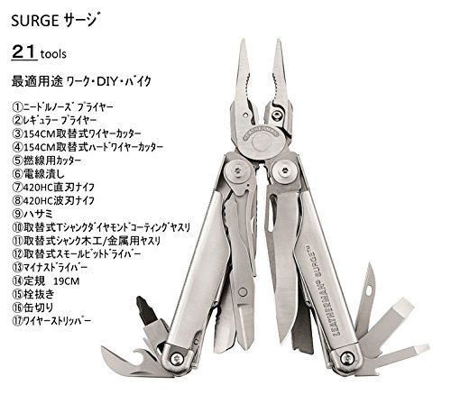 【製品概要】レザーマンのプライヤー型製品の中で、最多機能と最重量をほこるモデルの「サージ」。大型代表モデルのウェーブをベースにリファインしたモデルでHEAVY DUTY TOOL(重作業用ツール)という位置づけをしています。大型でハードに使える各ツールは剛性も高く、実用性に繋がってます。軍隊から整備士などの、プロの現場に対応する携帯工具のプルスペックモデルです。 【製品規格】「サイズ全長:11.5㎝(収納時)「ナイフ刃渡り:7.8㎝」「重量:335g」「製品機能数:21」「価格:14,900円」※価格は平成30年1月12日現在、上記amazon URL記載のもの
