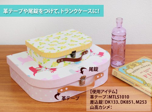 こちらのバックはトランク型のバックです。基本となる箱の形をトランクの形にして、持ち手の部分、留め具、ちょうつがいの部品を取り付ければ、オリジナルトランクの完成です!また、インターネットの通販サイトではトランク型に仕上がる、カルトナージュキットも売っています。