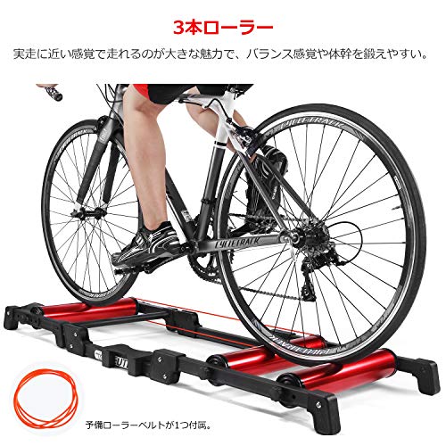 ・三つ折りでコンパクト ・伸ばして設置してもしっかりと安定、自転車でのってももちろんガタガタしません ・もちろん初めてなのでクネクネとなりますが、しっかりペダリングできます ・まだ高速回転させられていませんが、ローラー音そのものはうるささは感じません ・予備用ベルトと必要簡単工具付きでした