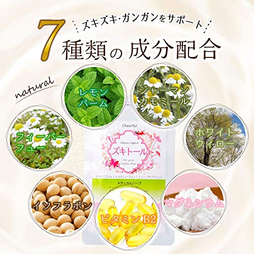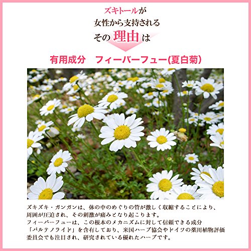 Amazonランキングで1位となっているフィーバーフューが入った頭痛サプリがこのズキトールです。フィーバーフュー以外のハーブも配合されていて主に女性に向けた商品となっています。1日の摂取量目安は3粒です。
