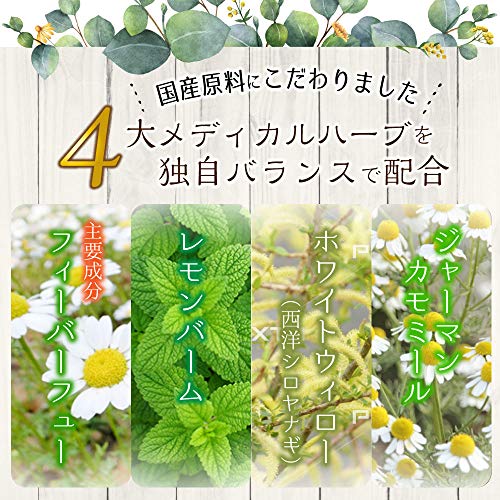含有ハーブ:フィーバーフュー(夏白菊)・ホワイトウィロー(西洋シロヤナギ)・レモンバーム(香水薄荷)・ジャーマンカモミール(カミツレ) 成分:大豆イソフラボン・酸化マグネシウム・ビタミンB2 内容量:90粒