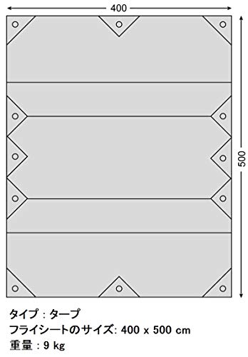 収容人数4~6人の少人数やファミリーでのキャンプにおすすめのサイズです。日よけとして、雨よけとして、リビングとして、使い勝手のいいタープです。 素材:ポリエステル65%、コットン35% サイズ:300cm x 400 cm 重量:7.5kg 耐水性:350mm