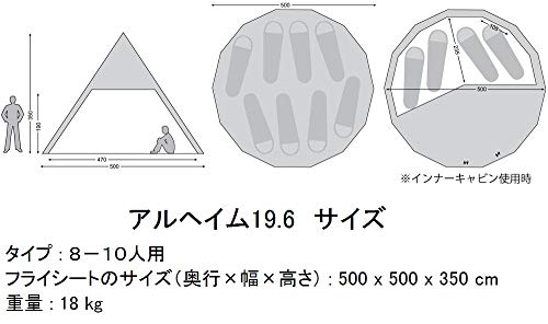 定員:8-10人(12畳ほどの広さ) アルフェイム12.6よりも一回り大きいサイズ。最大10人まで収容可能だが、快適に過ごしたいのであれば8人ほどがおすすめです。12.6と同じく設営も楽にできます。 こちらも薪ストーブを使う方であれば煙突の穴を開ける必要がないのでおすすめですよ。 •サイズ:500x500x350cm ※ジップインフロア・インナーキャビンは別売 •収納サイズ:80x36cm •重量:18kg •素材:ポリエステル65%、コットン 35% •耐水圧:350㎜