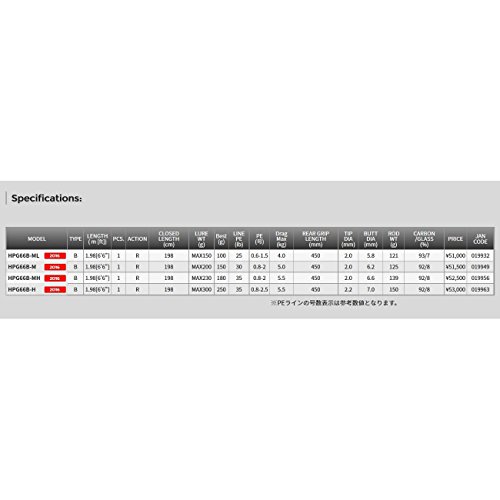 ロッドタイプ:ベイト 釣れる魚:ハマチ・メジロ・ブリ・サバ・シーバス・タチウオ・マダイ・根魚など、近海ライトジギング全般 長さ(ft):6'6" ルアー荷重(g):MAX150 PEライン(号):0.6-1.5