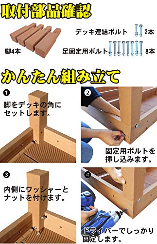 ボルトオン(ボルトとナットで固定する)タイプになっているので、組み立ても説明書通りに従えば簡単に間違えることなくできます。DIY初心者やあまり組み立て慣れしていない方でもやりやすいウッドデッキキットです。