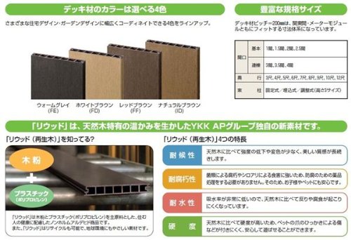 カラーバリエーションが豊富なため、イメージに合ったウッドデッキを探しやすいです。フェンスなどは別売りになりますが、その分カスタマイズを楽しめるため、予算やスペースに余裕のある方におすすめです。