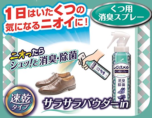 ノンスメルくつ用スプレーのおすすめポイントは、サラサラパウダーを配合している点です。サラサラパウダーは、ムレやべたつきを防ぎます。また、ノンスメルのくつ用スプレーは速乾タイプのスプレーなので、外出前に使用可能。