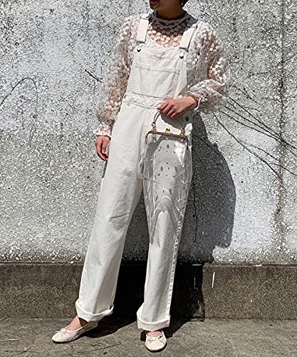 レディースのオーバーオールのコーデ例です。ホワイトカラーのシフォンブラウスは、上半身を大きく見せてしまうことがあります。しかし、そこに濃いブルーカラーのオーバーオールを取り入れることで、女性の華奢さを演出。