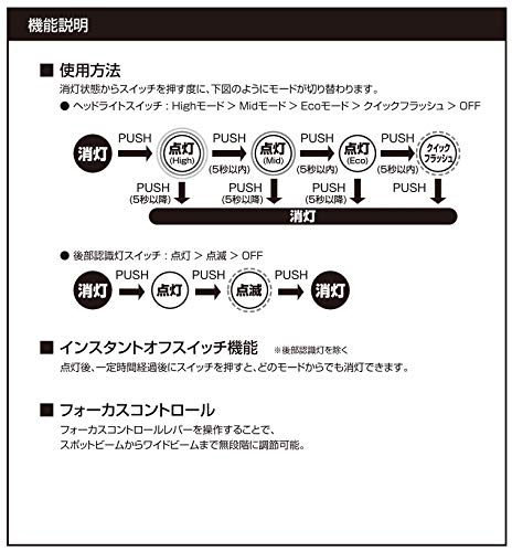 ライトの点灯時間:7.5時間(Highモード)、20時間(Ecoモード)、65時間(RED LEDモード)