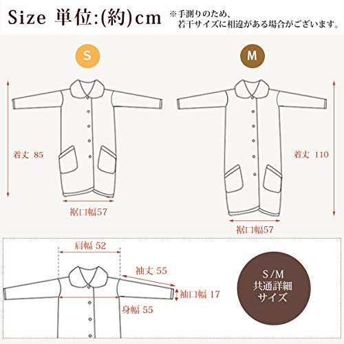 歩行している時に足元がはだけないように腰下部分にはだけ防止用のボタンを付けてあります。内側部分にはゴム入りの袖が付いていますので、家事などの作業をする場合に素早く搾る事ができる特長もあります。表地は一本一本の繊維へと丸くふわっとした加工が施されていて肌触りの心地良い質感となっています。