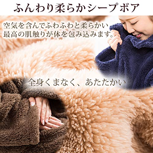羊毛に似たふわふわ質感で保温性に優れたシープボア生地を採用して作られているおしゃれなデザインの着る毛布で、少し暖かい時期であれば布団いらずで肌触り良く快適に就寝する事ができます。