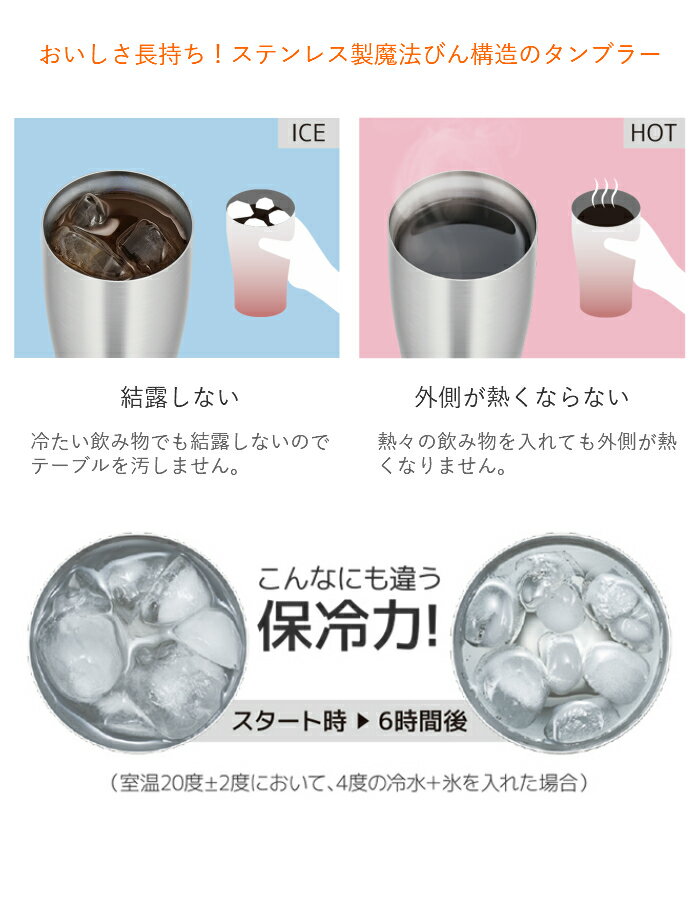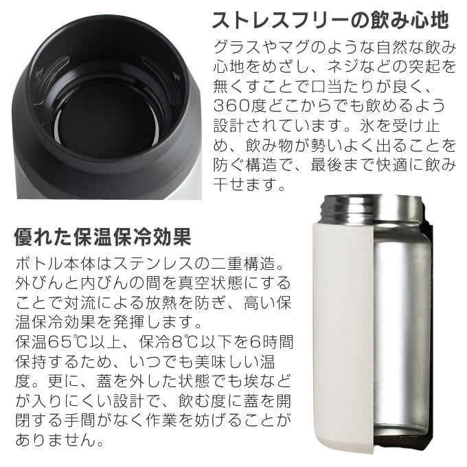 ステンレス製魔法びん構造なので、保温と保冷どちらでも使用可能です。冷たい飲み物を入れても、表面が結露しないので机やテーブルクロスを水滴で濡らしません。