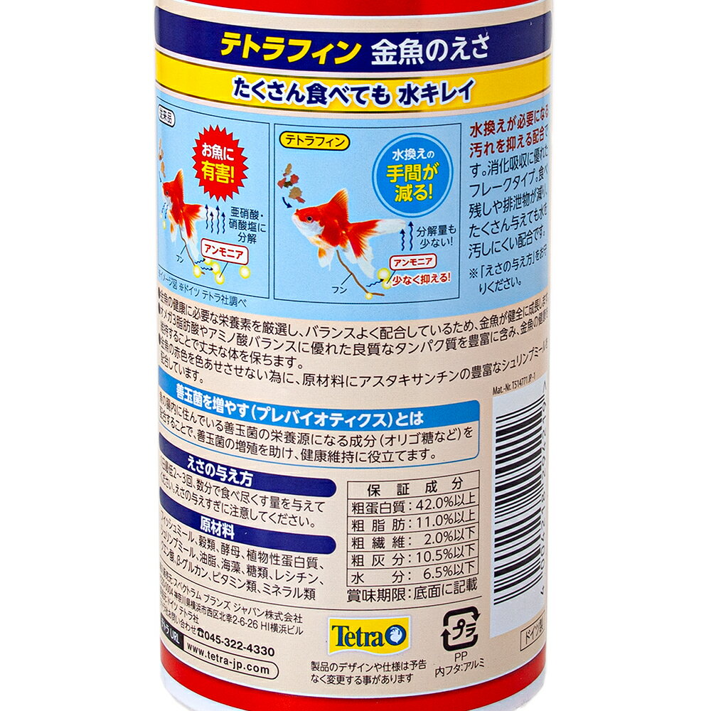 出典: https://www.amazon.co.jp/%E3%83%86%E3%83%88%E3%83%A9-Tetra-%E3%83%86%E3%83%88%E3%83%A9-%E3%83%86%E3%83%88%E3%83%A9%E3%83%95%E3%82%A3%E3%83%B3-52%EF%BD%87/dp/B0015XMKMW/ref=sr_1_4?ie=UTF8&qid=1547167466&sr=8-4&keywords=%E3%83%86%E3%83%88%E3%83%A9%E3%80%80%E3%83%86%E3%83%88%E3%83%A9%E3%83%95%E3%82%A3%E3%83%B3最もオーソドックスで人気な製品の一つが、王道メーカーであるテトラの「テトラフィン」です。こちらは消化吸収のしやすいフレークタイプとなっており、排泄物も少ない為、水槽の水が汚れにくいことと、栄養バランスもしっかり考えて作られた万能な金魚のフレークとなっています。