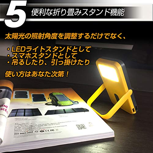 スマホに繋いで充電中は、本体の下部にある4つのブルーランプにより点灯状況を確認する事が可能です。便利な折りたたみスタンド付きのソーラーバッテリーになりますので、フックから吊り下げて使用したり、立て掛けて使用したりと、様々な使い方ができて便利です。同時に2台のモバイル機器を充電する事も可能です。