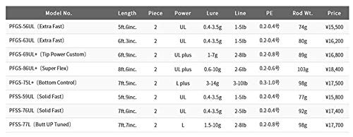 レングスを延長したチューブラーティップのジグ単モデルです。EXファースト、スペックも「56UL」と同一ながら、長さを活かしたゲーム展開が楽しめる6.3フィート。ジグ単をメインにアジング、メバリングを楽しめます。パームス公式サイトではプラグもOKと紹介されているので、インプレは「56UL」とのアクションの違いについてもチェックしておきましょう!