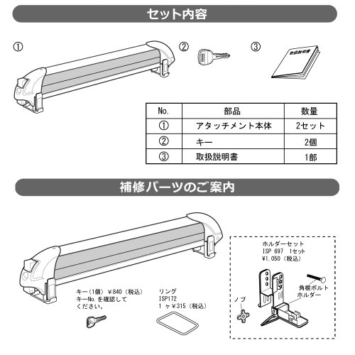 こちらのの純正スキーキャリアは、片開きタイプです。機能的には、カー用品メーカーのスキーキャリアと遜色ありません。ベースキャリアに取り付けるタイプで、取り付けに必要な部品がセットになっています。