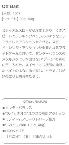 3分割されたウェイト配置が個性的、遠浅サーフ攻略に適した鉄板バイブレーションです。スイム姿勢を並行に、細身のデザインとすることで、サーフで気になる鉄板バイブの引き抵抗を軽減。持ち味であるハイピッチなアクションと使用感を両立するようなセッティングになっています。公式ホームページでは17gで1.5m程度、25gで2m程度を引ける、と紹介されているので、浅場に鉄板を入れてみたかった方は是非試してみてください!