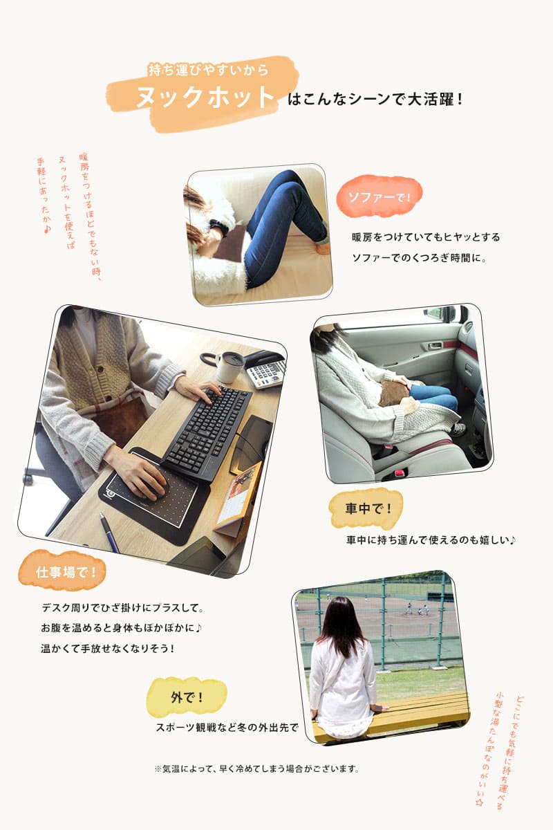 また、こちらの湯たんぽは小さめサイズとなっているため、普段の生活でも取り入れやすいのがポイントとなります。