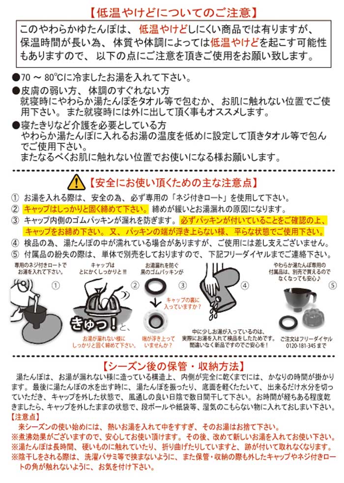 【素材】<本体>溶融亜鉛メッキ鋼板/ <口金>しんちゅう/ <パッキン>合成ゴム/ <湯たんぽ袋>ポリエステル100%