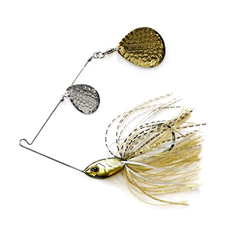 スピナーベイトとは1枚ないしは 2枚のブレードとガードの無い ラバージグを細い金属の棒で繋げた 形をしたルアーで、一説によると 小魚の群れを模していると言われて います。 ブレードによりバスに対する 高いアピール力を持ち、また 比較的根がかりする可能性が 少ない為、初めてのフィールド で地形を探るために手返し良く 投げて使うパイロットルアー としても人気のルアーです。