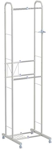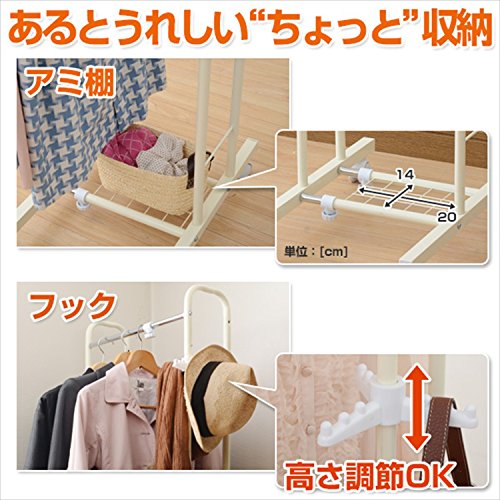 スリムサイズのハンガーラックで、幅を35cm〜49cmの間で自由に調節する事が出来ますので、お部屋のちょっとしたスペースに収めて使用する事が出来るハンガーラックになります。ハンガーラックの上部にはフックが付属されていて、三方向にある為、日頃から使用している帽子やバッグやアクセサリーなどの小物類をひっかけられます。また網棚も下に付いていますので、収納箱などを置いておく事も可能です。