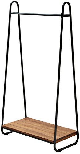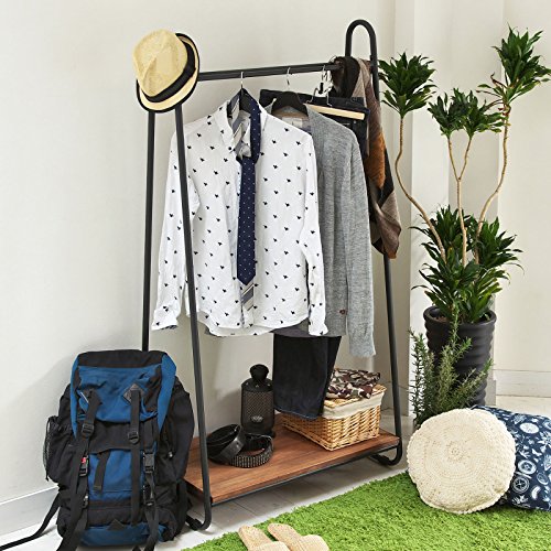 ブラウンの木製の棚板が下についていて、漆黒の頑丈なアイアンフレームを採用して作られているスリムサイズの北欧風ハンガーラックになります。