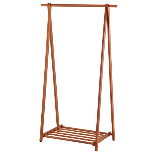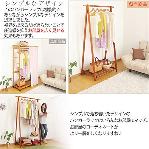 こちらのハンガーラックは天然の竹を使用して作られている人気のハンガーラックになります。洋服に限らず、帽子やカバンなども収納する事ができ、下には棚板も設置されていますので、収納用の箱やサンダルや靴などを置いて管理する事も可能です。