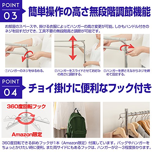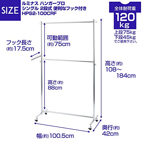 出典: https://www.amazon.co.jp/%E8%80%90%E8%8D%B7%E9%87%8D120kg-%E4%BE%BF%E5%88%A9%E3%81%AA%E3%83%95%E3%83%83%E3%82%AF%E4%BB%98%E3%81%8D-HPS2-100CRF-HPS-2-100-CRF/dp/B075LCW4N5/ref=sr_1_1_sspa?s=home&ie=UTF8&qid=1531550596&sr=1-1-spons&keywords=%E3%83%8F%E3%83%B3%E3%82%AC%E3%83%BC%E3%83%A9%E3%83%83%E3%82%AF+2%E6%AE%B5&psc=1サイズ / 幅100.5 × 奥行42 × 高さ108-184cm