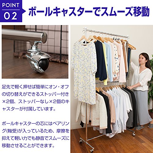 安いハンガーラックのスチールポールの厚みと比較しても肉厚な為、細身ながらも頑丈な作りのポールとなっています。掛ける衣類の種類に応じてハンガーの高さを無段階調節する事が出来るのも魅力的です。またストッパー付きのボールキャスターにより、スムーズな移動が可能な為、お部屋のお掃除を行う際にも楽々移動出来ますので、力の弱い女性の方にも扱いやすくおすすめなハンガーラックになります。