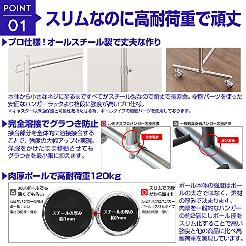 業務用のハンガーラックとして設計されていますので、通常のハンガーラックと比較して、強度や耐久性に優れている頑丈な作りが特徴です。キャスター付きのハンガーラックになりますので移動するのにも簡単な為、お部屋の模様替えを行う際にも楽々移動出来ます。またスリムサイズになりますので、お部屋の場所を選ばずに設置出来るのも魅力的です。