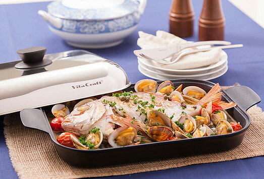 重みがあり、気密性に優れたステンレス製の蓋を用いるだけで、高温の水蒸気を閉じ込めて焼き上げる使い方ができますので、魚もふっくらと美味しく仕上げてくれます。