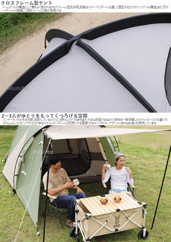 DOD(旧ドッペルギャンガー)は、ワンタッチテントで人気のあるブランドです。もともとキャンプで使う本格的なテントを発売している会社なため、耐水性などは本格的なテントと同じ1500ミリと、雨が降っても浸水しないので便利です。