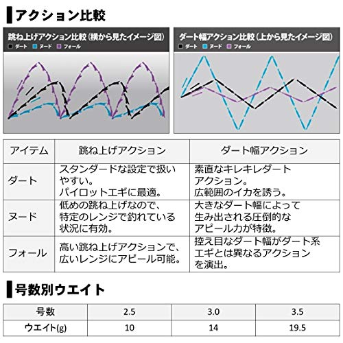 エギのアクションは横方向に動くダートアクション、縦方向に動く跳ね上げ、フォールアクションの2つがメイン。先ほどご紹介したダートは横方向、縦方向どちらにも素直に動くようなエギでしたが、こちらは縦方向の動きに特化したモデルになります。横に飛ばない分、縦の跳ね上げが大きく、イカにエギを見つけてもらうような釣り方におすすめ。沈降速度は3.5号で3.5秒とスタンダードな設定です。