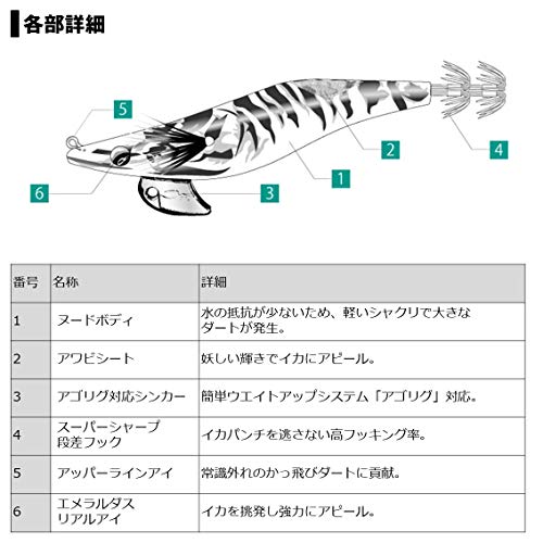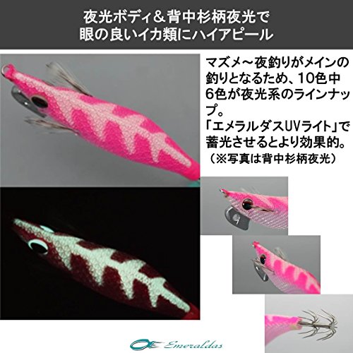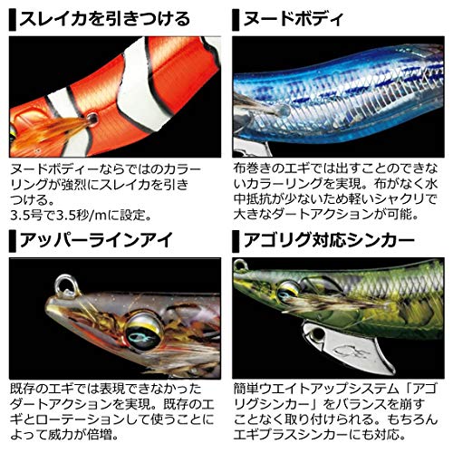 通常のエギは布や布に近い素材を巻いて、イカが好むスローな動きと抱き心地を演出しますが、エメラルダスヌードは布を廃した樹脂ボディ。抵抗の少ないボディから生まれる幅のあるダートアクション、布では出せない独特の色味をコンセプトにしたアイテムです。横方向への動きが非常に大きいので、ローテーションの1本におすすめ。フラッシングの効くカラーは、デイゲームにおすすめです!