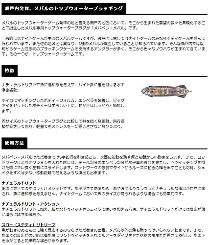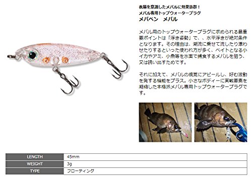 メバルトップルアーを代表するアイテムです。人気ルアーらしく派生モデルが数多く登場、カラーやサイズは豊富なラインナップから選べます。水平にこだわった浮き姿勢、ドリフトをメインにただ巻き、トゥイッチと使い方も自由。小イカ、アミにメバルがボイルしている状況には、メバペン・メバルFを投入しましょう!ボディサイズ、フックサイズを選べば、小型から大型まで楽しめます!