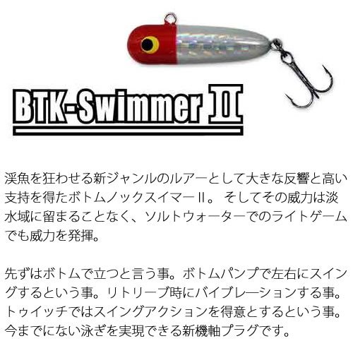 変わり種ルアーもご紹介!渓流トラウト人気がで爆発した「ボトムノックスイマーII」のSWカラーをチェックしてみましょう!ラインアイの位置が特徴的なルアーで、頭からボトムに当たるような姿勢で沈降。トゥイッチを入れると左右にダート、リトリーブではバイブレーションのような動きを見せます。3.2gの自重に空気抵抗の少ないスリムなボディで飛距離は抜群!底を釣るルアーを用意するときは、バイブレーションと合わせてボトムノックスイマーも検討してみてください!