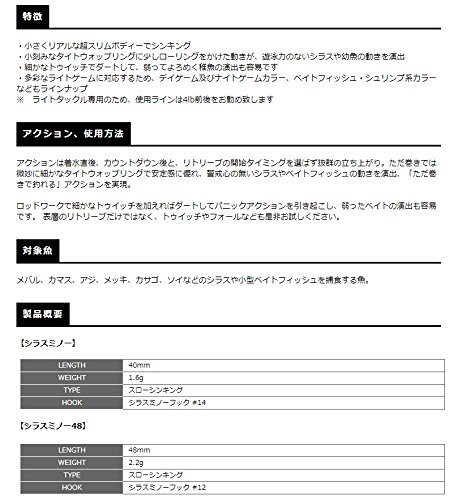 ルアーウェイト1.6gと他のライトゲーム向けミノーと比べてかなり軽量。フックサイズも#14と小型フックを搭載しています。飛距離は重さが無くそれなりといった程度ですが、この軽さがアクションに弱さを与えるポイント!細いライン、弱いロッドと組み合わせて、シラスミノーの性能を引き出しましょう!