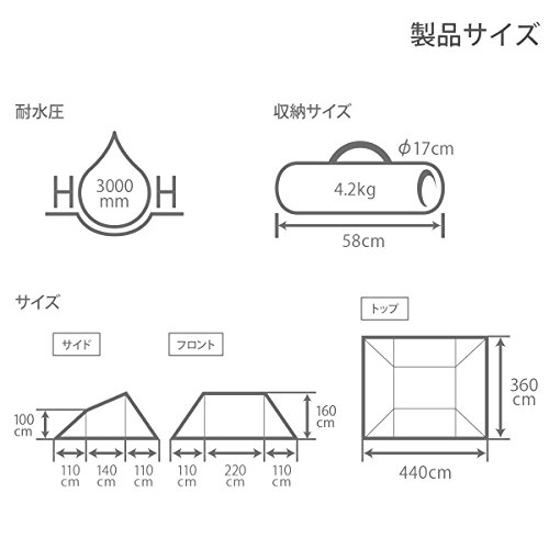 | 素材 | アウターテント:ポリコットン(ポリエステル65%、綿35%、撥水加工) フロア:210Dポリエステル(PUコーティング) |