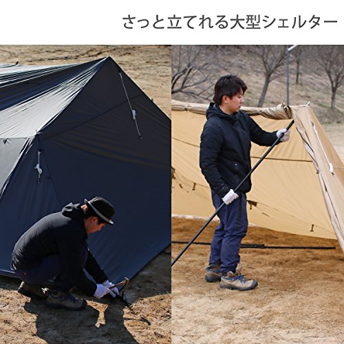 大人数でのグループキャンプにおすすめのタープです。様々なアレンジが可能で、使い方はあなた次第!大型のタープながら、コンパクトな収納サイズで持ち運びも便利です。燃えにくいポリコットン素材を使用しているため近くで焚き火も可能。コスパにも優れたタープです。※ポールは別売りです。
