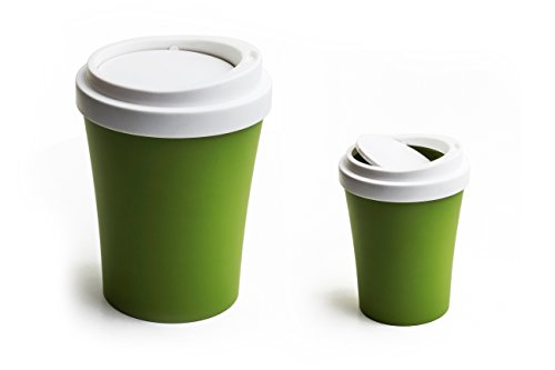 コーヒーショップで販売されているコーヒーカップのデザインを採用したゴミ箱になります。フリップタイプのフタ付きで、コーヒーカップのように飲み口も付いていますが、穴自体は開いていません。