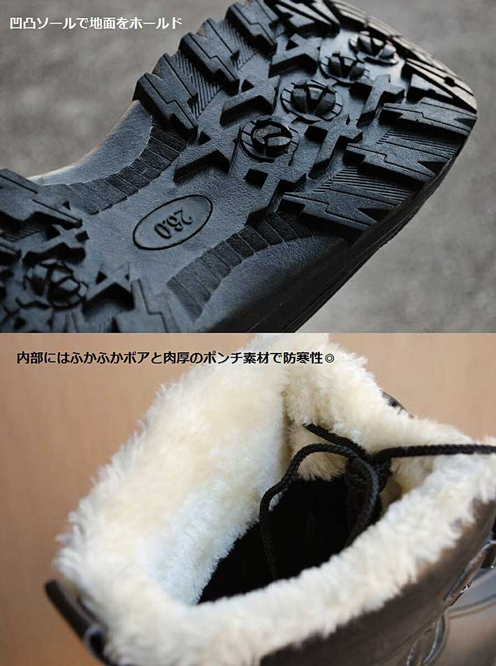 冬にピッタリなメンズ向け靴をお探しの方には、こちらのモデルがおすすめです。内側にはモコモコしたフェイクファーを採用しており、隙間からの風を防ぐだけでなく、デザイン性も抜群。