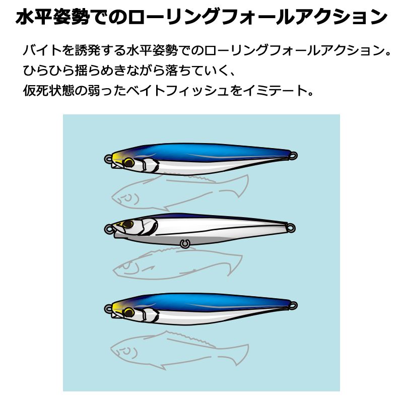 水平姿勢が安定するようにバランス調整されているので、飛距離も稼げますし、ひらひら落ちていく弱った魚のようなローリングフォールアクションがバイトを誘います。