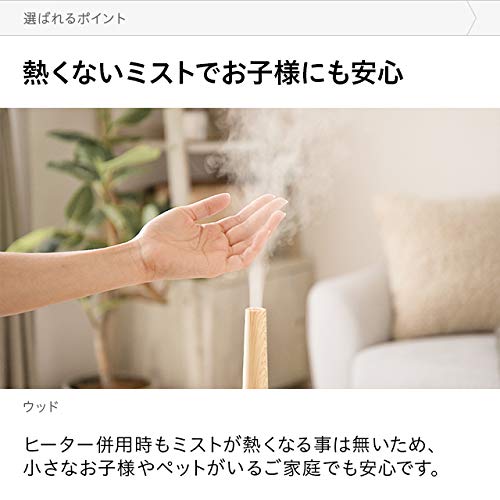 超音波で水を気化させるためミストが熱くなることはなく、子供やペットがいる家庭でも安心安全に使えますよ。価格も比較的安い加湿器で、口コミ評価も高い人気製品です。
