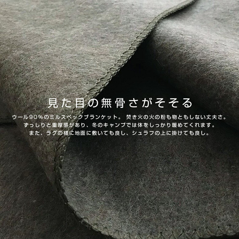 ウール90%で焚火にびくともしない。2×1.5mのサイズ感と程よい重さ。 値段も手頃(4000円前後)でバランスが良い。